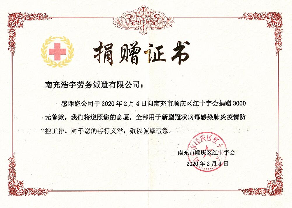 我公司向南充紅十字會(huì)捐贈(zèng)3000元用于抗擊疫情